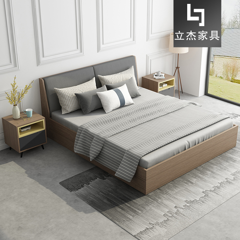 材質:標準環保E1級三聚氫氨板,防火,耐磨,防污,硬度高. 表面啞光效果持久,強度高,剛性好,不變形,比重合理,所有板材均為經防蟲防腐化學處理。人造板游離甲醛放量<9mg/100g,達到歐洲E2級標準,封邊:優質厚PVC封邊 。加厚布藝大軟包靠背,柚木色床身,排骨架