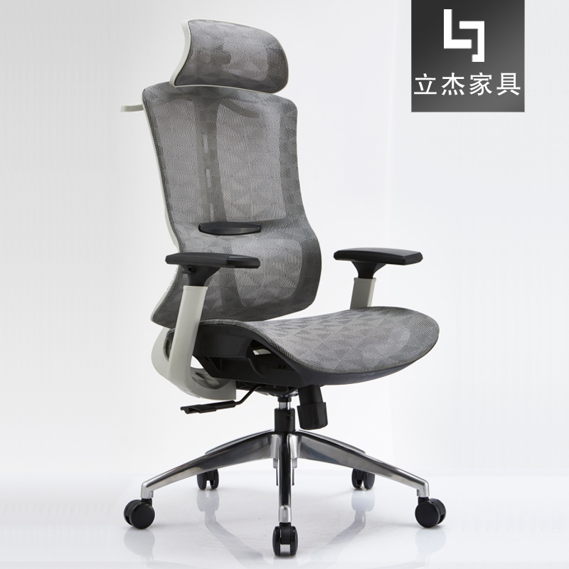 頭枕:灰/黑色全新料加玻纖頭枕可升降旋轉調節帶衣架 椅背:框架采用灰/黑色全新料加玻纖 面料:背座采用進口特網 扶手:采用全新料加玻纖固定扶手 座墊:全特網鏤空座 底盤:三檔鎖定底盤,可向后仰調節 ,最大后仰角度130度,底盤厚度3.0MM 氣桿:三級氣桿85下4 腳架:350mm鋁合金腳   腳輪:55mmPU靜音腳輪過BIFMA