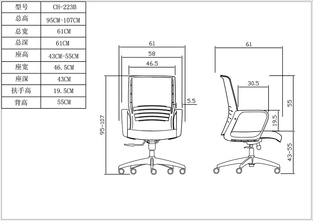 背采用福祥JF295系列,座采用源信AK30系列的布,PP+玻璃纖維背架,配40密度高彈力海綿,中班蝴蝶底盤,PP扶手,120#沉口4公分,PA-325尼龍腳,∮50MM黑色尼龍輪 |