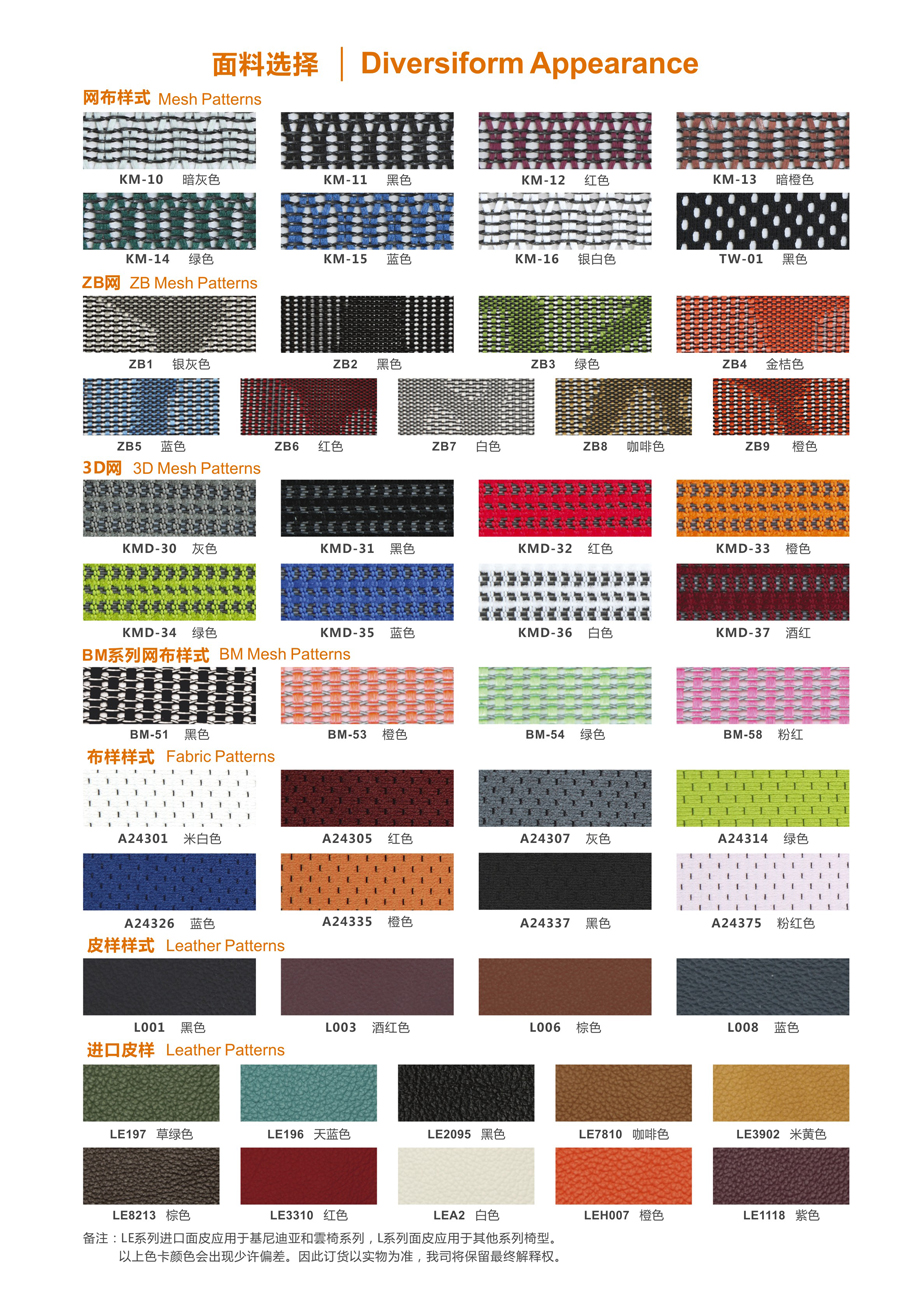 背墊、座墊優質進口網布;白色/黑色塑膠框架,黑色塑膠扶手;鋼質電鍍/鋼質白色烤漆/鋼質黑色烤漆四腳架,尼龍滑輪。